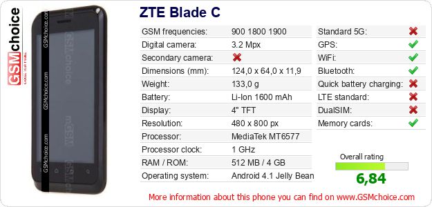Do you have your website? Do you want to insert information about basic phone data of ZTE Blade C somewhere? It is very easy. You can download the picture, or copy and paste the code below on the page:Pasting this code will display the following image: