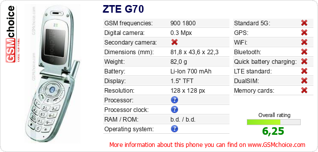 Do you have your website? Do you want to insert information about basic phone data of ZTE G70 somewhere? It is very easy. You can download the picture, or copy and paste the code below on the page:Pasting this code will display the following image: