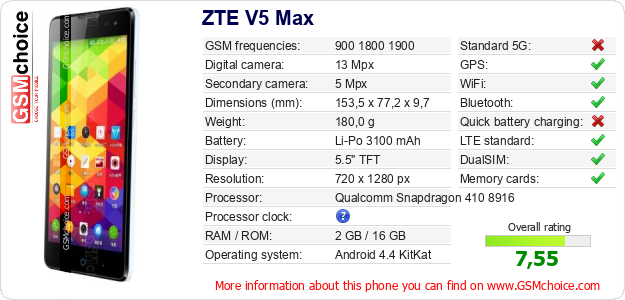 Do you have your website? Do you want to insert information about basic phone data of ZTE V5 Max somewhere? It is very easy. You can download the picture, or copy and paste the code below on the page:Pasting this code will display the following image: