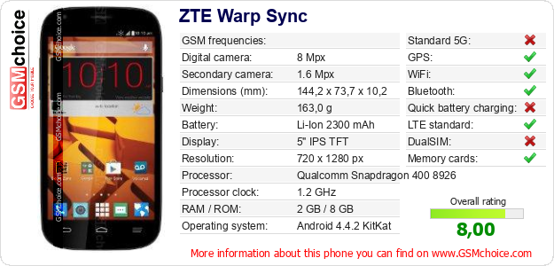 Do you have your website? Do you want to insert information about basic phone data of ZTE Warp Sync somewhere? It is very easy. You can download the picture, or copy and paste the code below on the page:Pasting this code will display the following image: