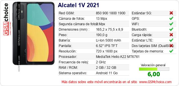 Datos del móvil Alcatel 1V 2021 en tu página