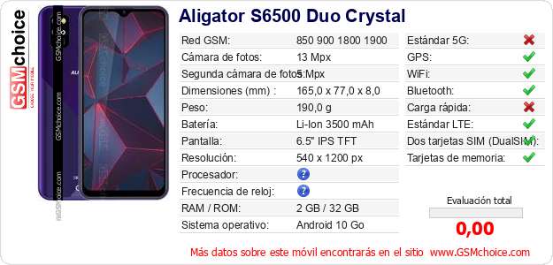 Datos del móvil Aligator S6500 Duo Crystal en tu página