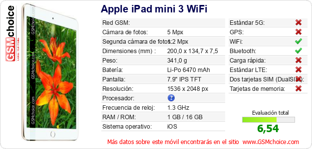 Datos del móvil Apple iPad mini 3 WiFi en tu página