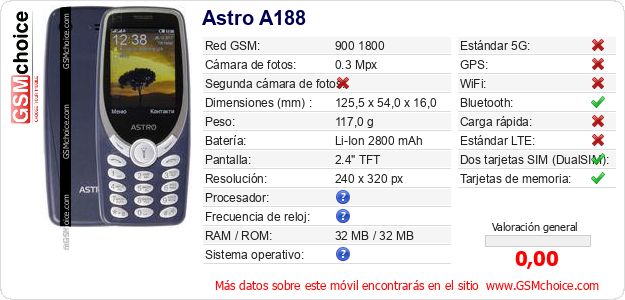 Datos del móvil Astro A188 en tu página