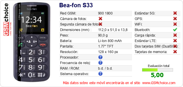 Datos del móvil Bea-fon S33 en tu página