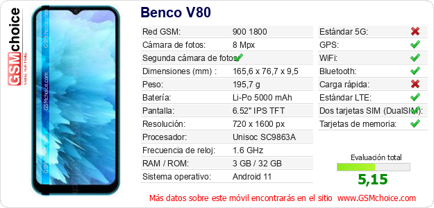 Datos del móvil Benco V80 en tu página