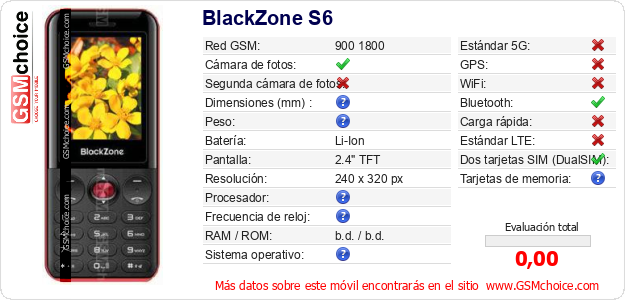 Datos del móvil BlackZone S6 en tu página