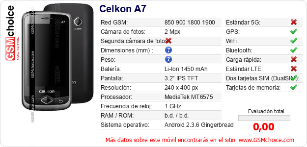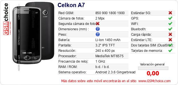 Datos del móvil Celkon A7 en tu página