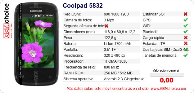 Datos del móvil Coolpad 5832 en tu página