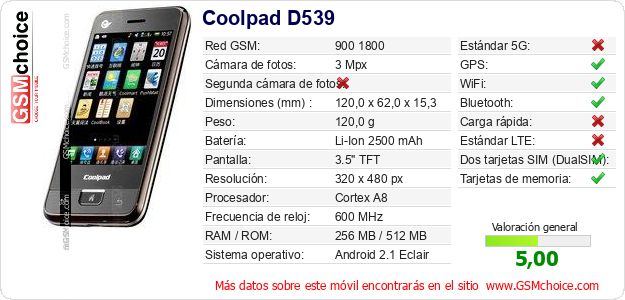 Datos del móvil Coolpad D539 en tu página