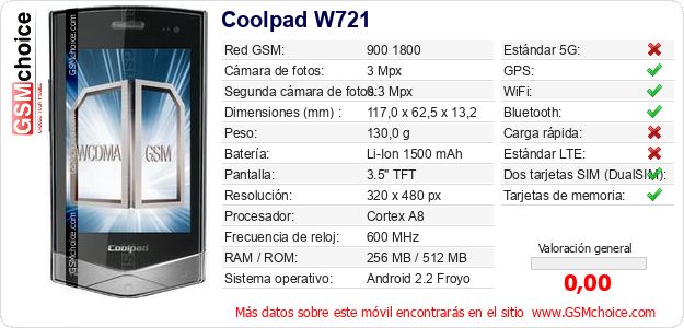 Datos del móvil Coolpad W721 en tu página