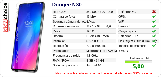 Datos del móvil Doogee N30 en tu página