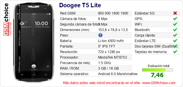 Datos del móvil Doogee T5 Lite en tu página
