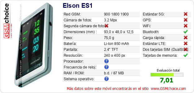 Datos del móvil Elson ES1 en tu página