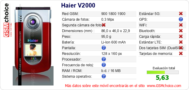 Datos del móvil Haier V2000 en tu página