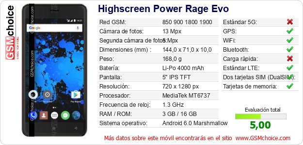 Datos del móvil Highscreen Power Rage Evo en tu página