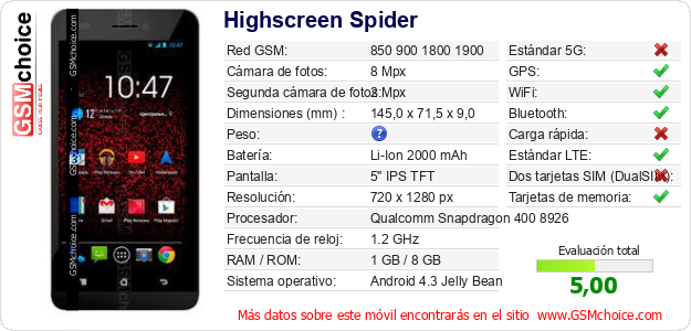 Datos del móvil Highscreen Spider en tu página