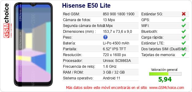 Datos del móvil Hisense E50 Lite en tu página