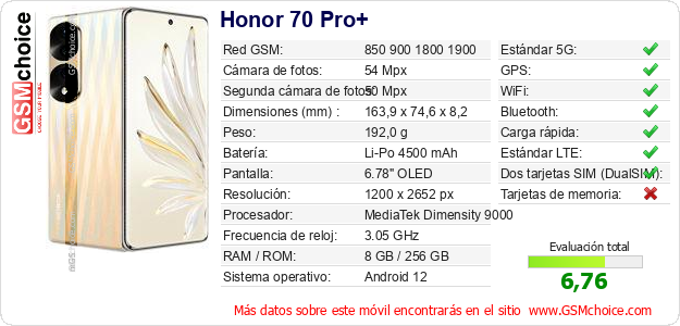 Datos del móvil Honor 70 Pro+ en tu página