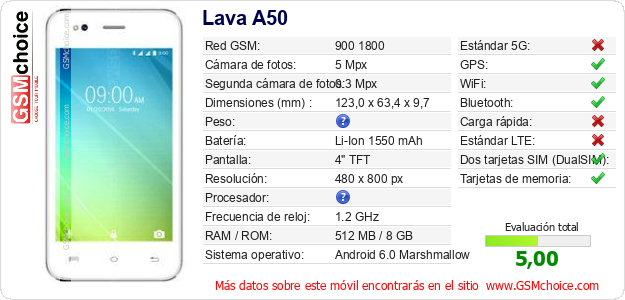 Datos del móvil Lava A50 en tu página