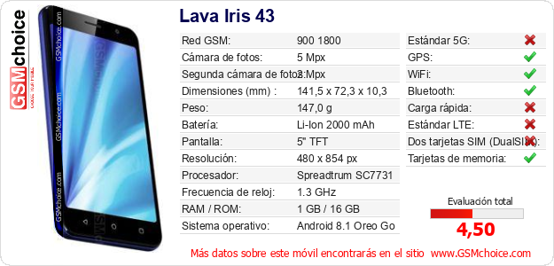Datos del móvil Lava Iris 43 en tu página