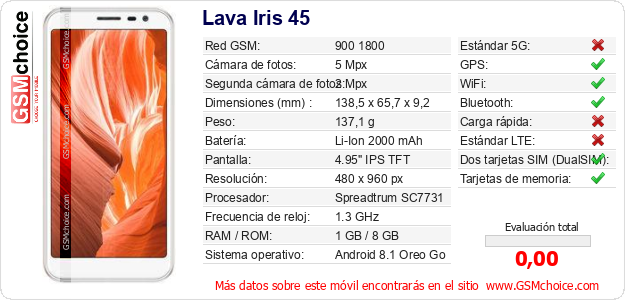 Datos del móvil Lava Iris 45 en tu página