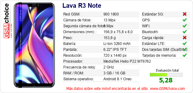 Datos del móvil Lava R3 Note en tu página
