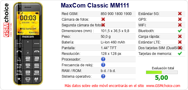 Datos del móvil MaxCom Classic MM111 en tu página