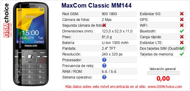 Datos del móvil MaxCom Classic MM144 en tu página