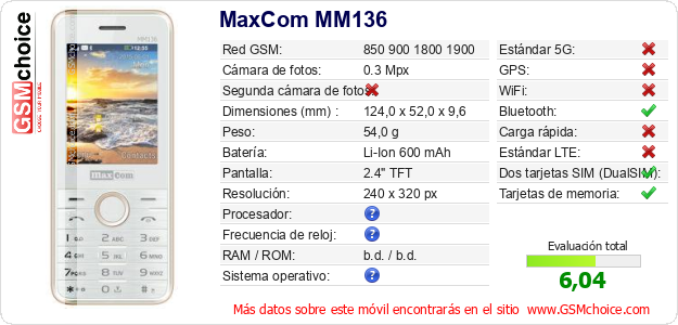 Datos del móvil MaxCom MM136 en tu página