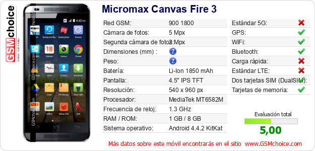 Datos del móvil Micromax Canvas Fire 3 en tu página