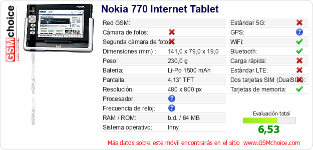 Datos del móvil Nokia 770 Internet Tablet en tu página