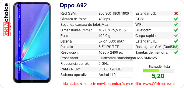 Datos del móvil Oppo A92 en tu página