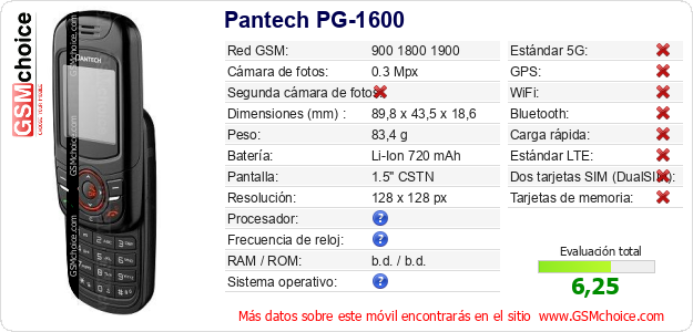 Datos del móvil Pantech PG-1600 en tu página