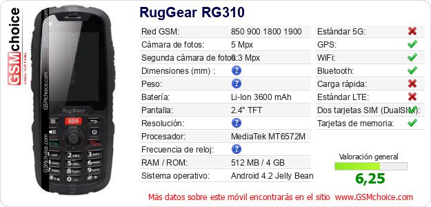 Datos del móvil RugGear RG310 en tu página