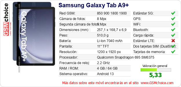 Datos del móvil Samsung Galaxy Tab A9+ en tu página