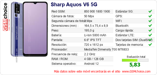 Datos del móvil Sharp Aquos V6 5G en tu página