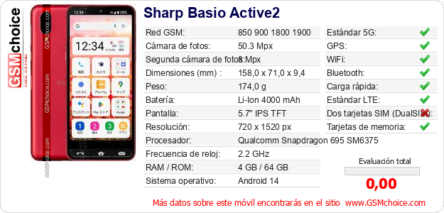 Datos del móvil Sharp Basio Active2 en tu página
