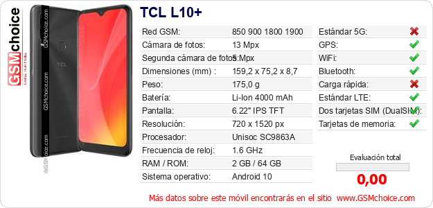 Datos del móvil TCL L10+ en tu página