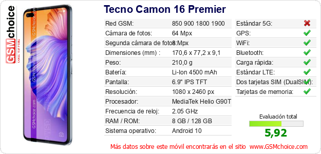 Datos del móvil Tecno Camon 16 Premier en tu página