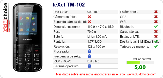 Datos del móvil teXet TM-102 en tu página
