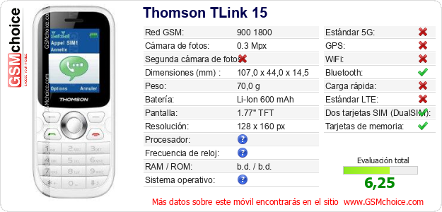 Datos del móvil Thomson TLink 15 en tu página