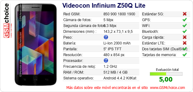 Datos del móvil Videocon Infinium Z50Q Lite en tu página
