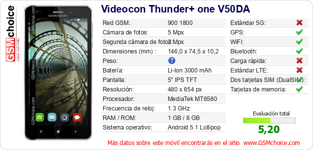Datos del móvil Videocon Thunder+ one V50DA en tu página
