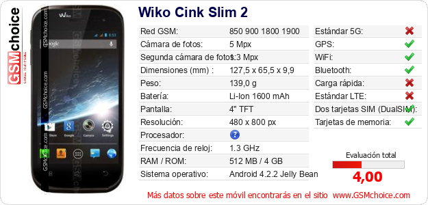 Datos del móvil Wiko Cink Slim 2 en tu página