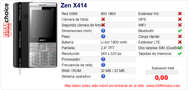 Datos del móvil Zen X414 en tu página