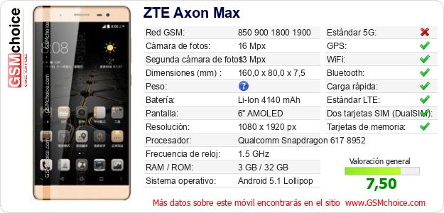 Datos del móvil ZTE Axon Max en tu página