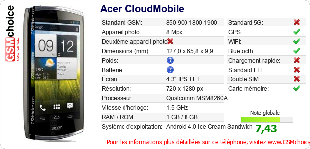 Publier les caractéristiques de ce mobile Acer CloudMobile sur votre site