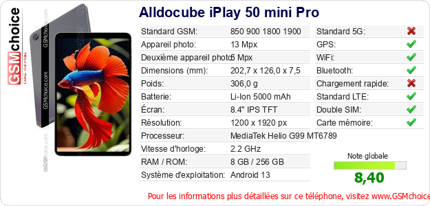 Publier les caractéristiques de ce mobile Alldocube iPlay 50 mini Pro sur votre site