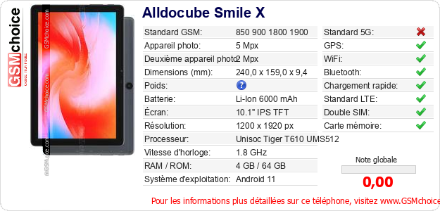 Publier les caractéristiques de ce mobile Alldocube Smile X sur votre site